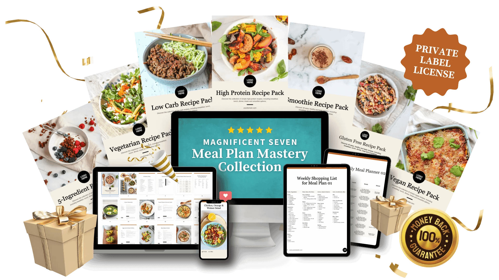 Seven distinct recipe packages for ultimate meal planning, including vegan, vegetarian, low-carb, gluten-free, high-protein, smoothie, and 5-ingredient recipes.
